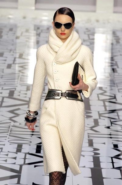 Нравится стиль милитари? Сочетайте белое пальто, в данном случае вязанное, с контрастным поясом цвета металлик. Желательно, чтобы у вас «оказалась» такая же сумка. Пара браслетов, очки, красная помада, и… «В чем сила, брат?» — «В красоте. Еще Достоевский говорил!»