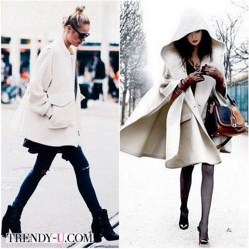 Пальто может быть коротким или длинным, но в любом случае – эта практичная вещь не покидает ряды моды. Восхитительно смотрится белое пальто кейп. Элегантная пальто-накидка прекрасно подойдет во время демисезона. Она отлично сочетается с брюками и каблуками. Платье и ботфорты с белым кейпом – еще одно гармоничное сочетание для романтичного образа.