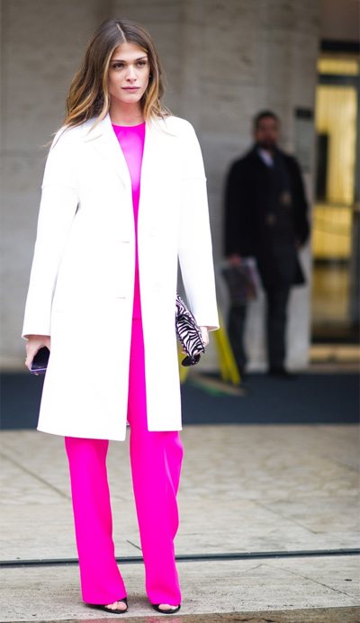 Гламурный лук: белое пальто и костюм цвета фуксии