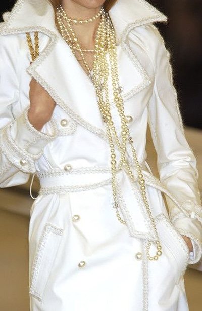 На фото — модный лук от Шанель. Белый тренч и жутко популярный в этом сезоне жемчуг!