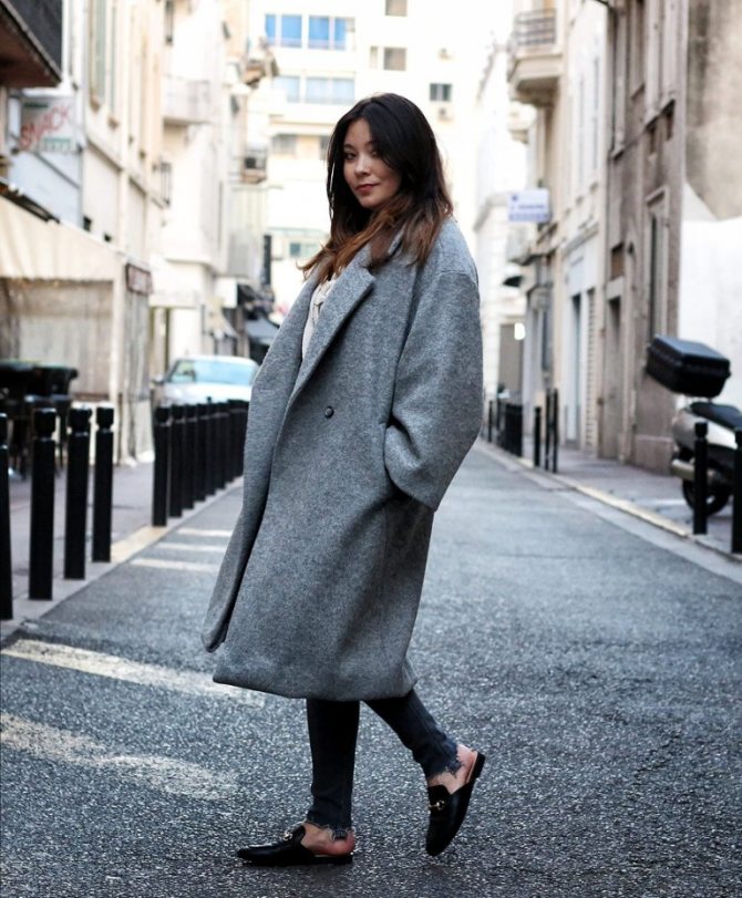 Пальто в стиле оверсайз выглядит строго и лаконично. Дизайнеры предлагают классические модели, с отложенными воротниками, двубортные и однобортные модели в стиле oversize. Пальто великолепно сочетается с обувью на каблуке: ботильонами, ботинками на тракторной подошве. Не менее стильно выглядят образы с кроссовками и кедами на толстой платформе.