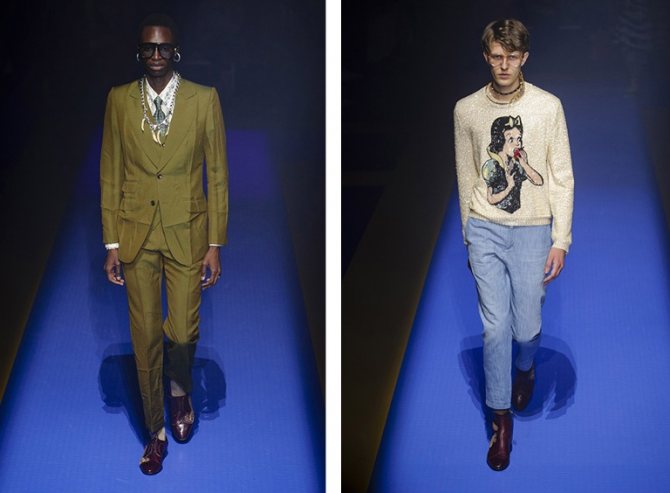 Разнообразие царит и в мужской части представленного. Здесь можно подобрать и вполне классические образы, и экстравагантные на грани фола. Желающие могут увидеть строгий деловой костюм, но в Гуччи настаивают, что о должен непременно сопровождаться аксессуаром в виде рогов на большой железной цепи. Есть другой вариант – костюм классический, но нарочито мятый и с тапочками-шлепками.