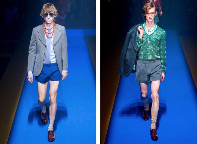 Любителям эпатажной оригинальности предлагаются образы из пиджака и шортов (больше напоминающих семейные трусы), но обязательно с галстуком, заправленным в эти самые трусы. Еще одна особенность мужской коллекции Gucci – поясные сумки предлагается иметь круглые, а располагать их на животе в центре. Несомненно, это намек на древнеримские доспехи, удачно вписавшийся в общую канву весенне-летнего показа.