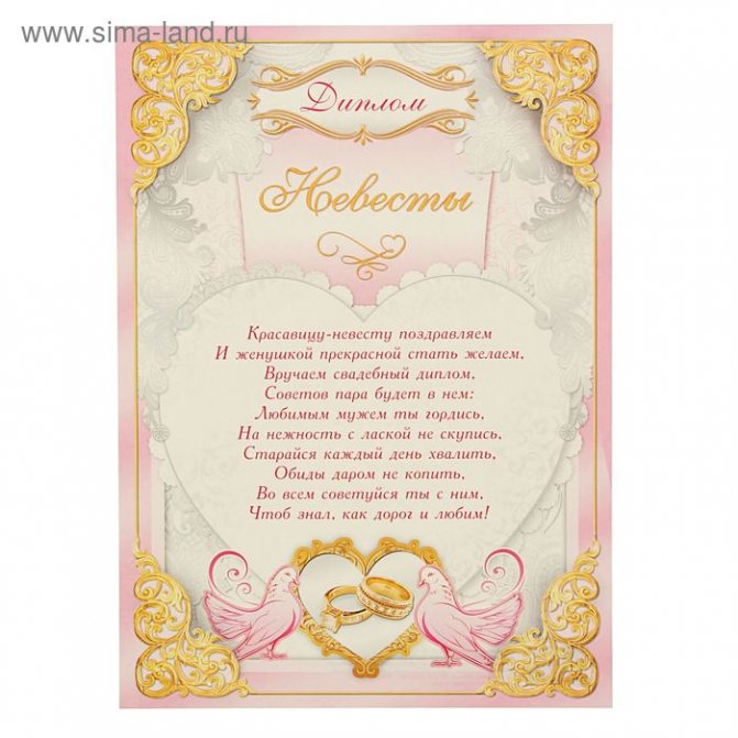 С сего (день, месяц, год свадьбы) повелеваю молодца (имя жениха) и красну девицу (имя невесты) считать мужем и женою, обоюдно согласившихся поменять свою привольную и свободную жизнь на супружескую, а посему надлежит принимать оных только совместно, а порознь не принимать всерьез, ибо они суть единое неделимое и целое.
