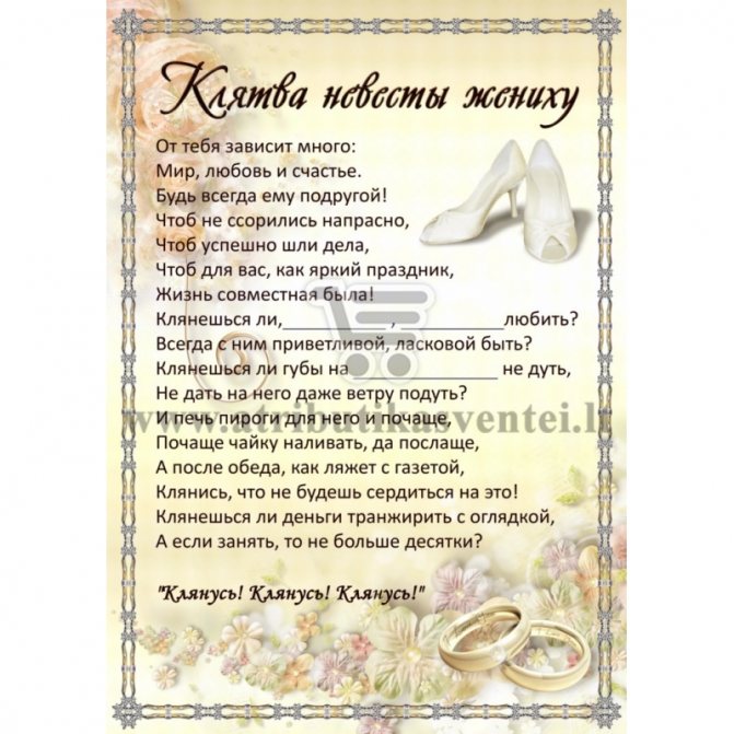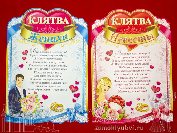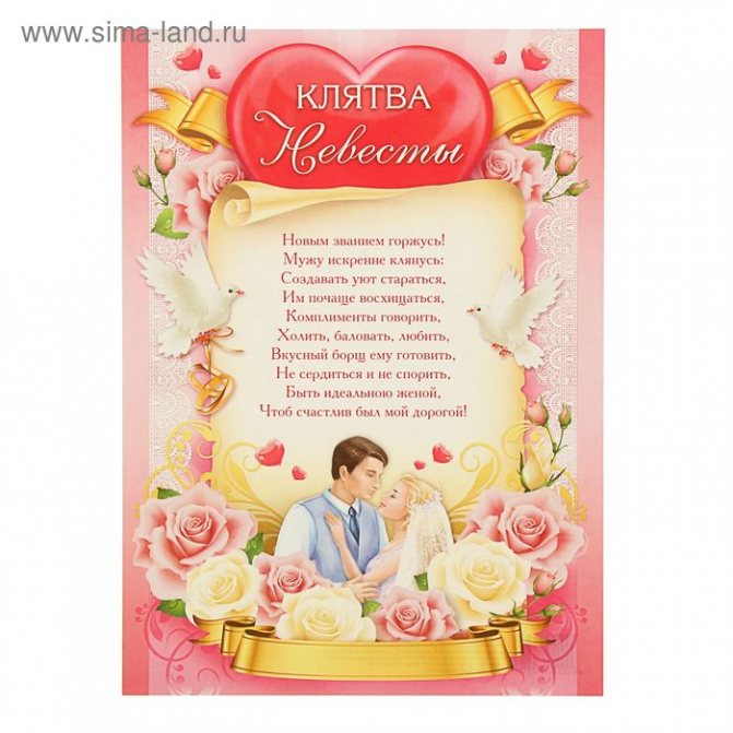 Невеста: «Я (ФИО) хочу взять в законные мужья (ФИО). Клянусь любить и уважать своего супруга, хранить ему верность, советоваться с ним по любым вопросам, быть внимательной и ласковой. Обязуюсь выполнять данную мною клятву как в богатстве, так и в бедности, в горе и в радости, пока смерть не разлучит нас»