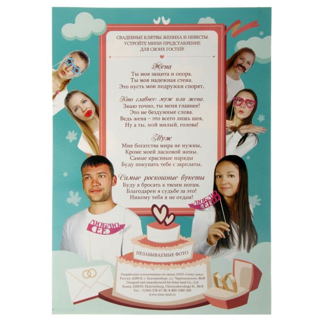 Она как правило произносится, между веселыми конкурсами для гостей, а смешной текст может содержать глубокий смысл. Такое обещание может содержать следующие слова: