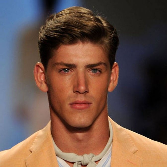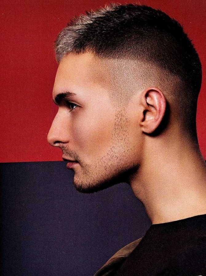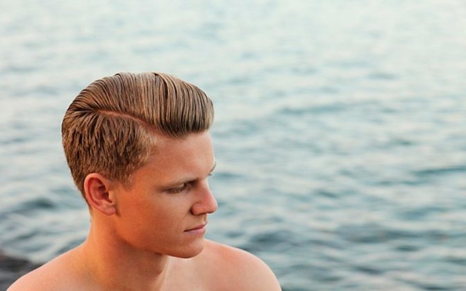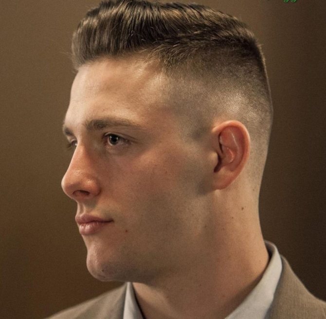Для придания элегантной брутальности можно использовать гель для волос, и с его помощью добиться эффекта «прилизанности». Такой вариант визуально наследует традиции стрижек в стиле милитари, популярных в 40-е года. Идеально подходит на светлые волосы, так что если вы блондин с жесткими густыми волосами, эта прическа создана для вас.