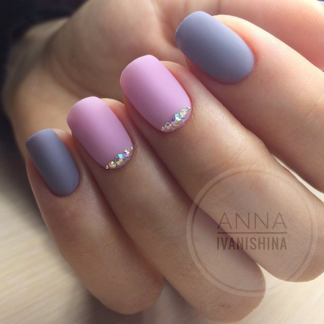 Оригинально выглядит двойной маникюр, где один или два ногтя выкрашиваются в один цвет, а остальные в другой. При этом цвета могут принадлежать одной гамме или быть контрастными.