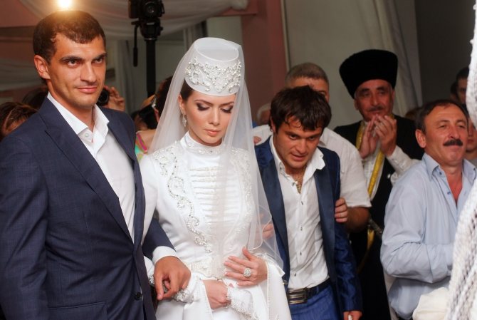 Свадебная одежда осетин полностью соответствует легендарному эпосу. Женихи уже редко облачаются в национальный осетинский костюм, но невесты не изменяют традициям. Ее наряд символизирует тело голубки, в котором когда-то предстала божественная царевна. Он состоит из обязательных элементов: длинных рукавов, которые символизируют возраст вступления в брак, нагрудники, узоры на подоле платья и на рукавах, а также металлический пояс. Само платье должно быть длиной в пол и полностью закрытым. Также наряд невесты дополняет шапочка, круглой формы, и фата.