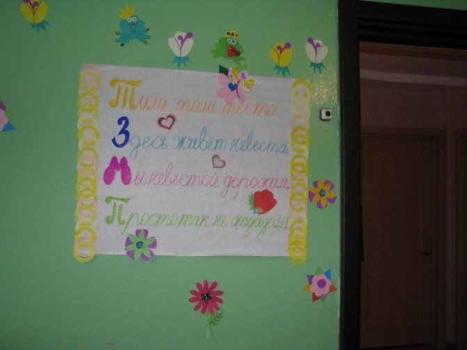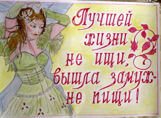 Дню бракосочетания предшествует девичник. Его также нужно организовать должным образом. Среди аксессуаров, используемых для украшения комнаты, особую роль занимают оригинальные плакаты. Изделия содержат как веселые, так и сентиментальные фразы, стихи, поздравления, пожелания. В самодельные транспаранты вставляют снимки новобрачной, ее подружек, сделанные за годы дружбы.