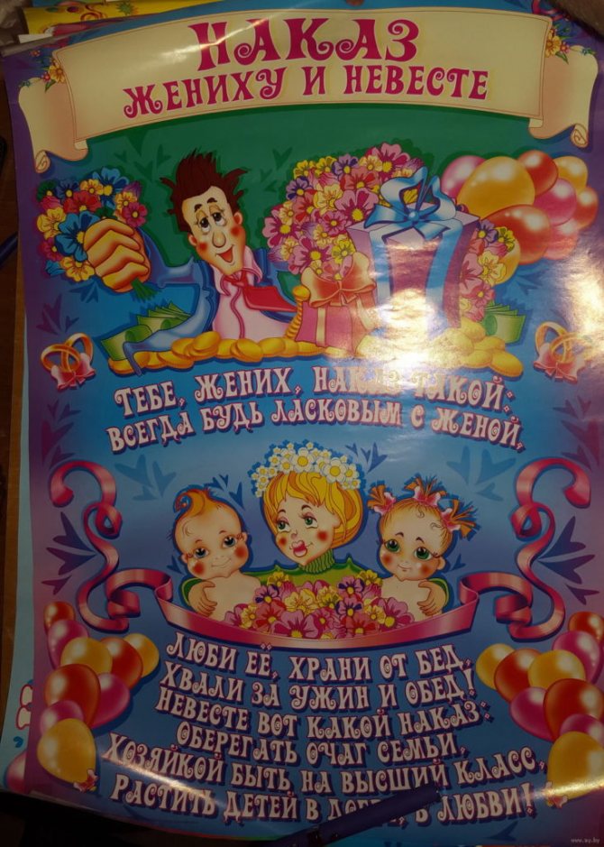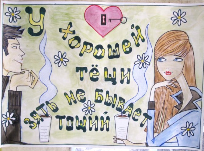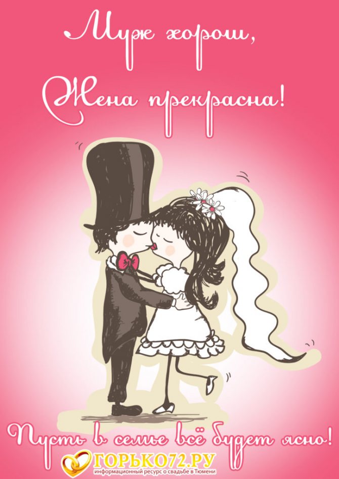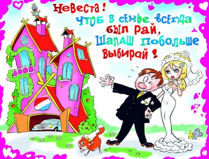 Соответственно, тематика таких изображений будет нести шутливые пожелания молодым, наказы теще, тестю, родителям жениха, остальным родственникам.