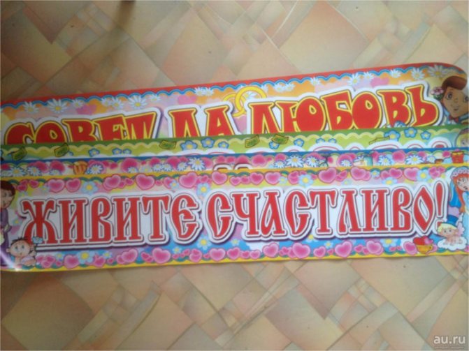 Оформления банкетного зала, автомобиля или дома, свадебными плакатами с лозунгами стала неотъемлемой частью свадебного торжества. За много лет сформировался устойчивый набор лозунгов, которые часто передаются из поколения в поколение и без которых уже никто не представляет себе празднование традиционной свадьбы.