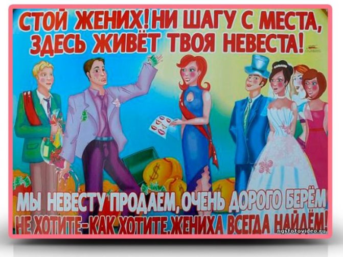 - «Продаём невесту – очень дорого берём, не хотите – как хотите. Жениха всегда найдём!»;