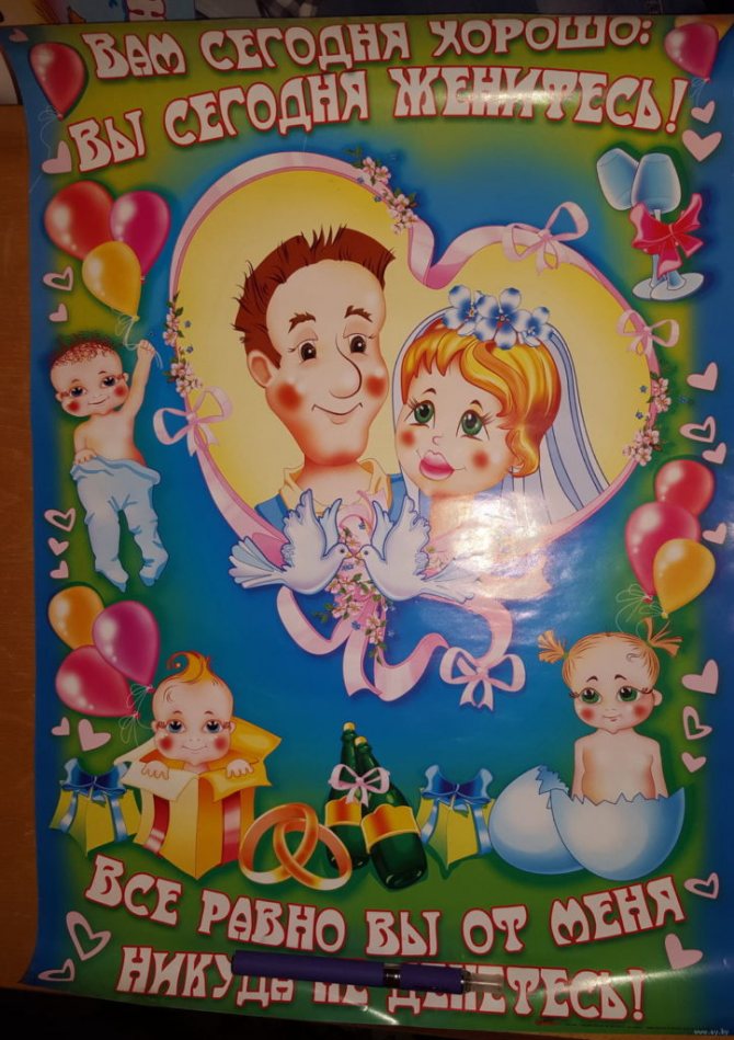 В свадебной церемонии участвуют два кольца: одно надевают на палец невесты, другое продевают в нос жениха. Роберт Орбен Красочно оформленные плакаты со свадебным лозунгом — замечательное дополнение к оформлению любого банкетного зала. Многие свадебные слоганы были придуманы не один десяток лет назад, но до сих пор являются актуальными, так почему бы не продолжить использовать эти прикольные надписи на свадьбу и сейчас. Также оригинальной идеей будет выпустить свадебную стенгазету состоящая из нескольких плакатов с веселыми фотографиями молодоженов, родственников. Все это поможет быстрее сблизить гостей и избавит от скованности, характерной для первых минут праздника.