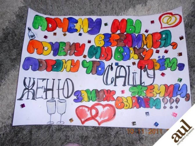Рисунки и надписи могут быть самыми разными – здесь всё зависит от фантазии подружек. Следует подготовить несколько плакатов с заданиями для жениха.