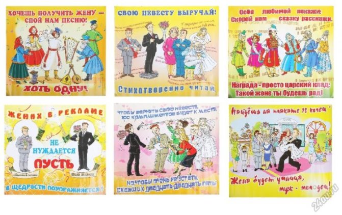 Добиваться портретного сходства с героями торжества не обязательно (для этого есть фото), впрочем, так же, как и с какими-либо персонажами. Нежелательно возлагать ответственность за оформление постеров на выкуп невесты на одного человека. Лучше, если это будет некий «творческий коллектив».