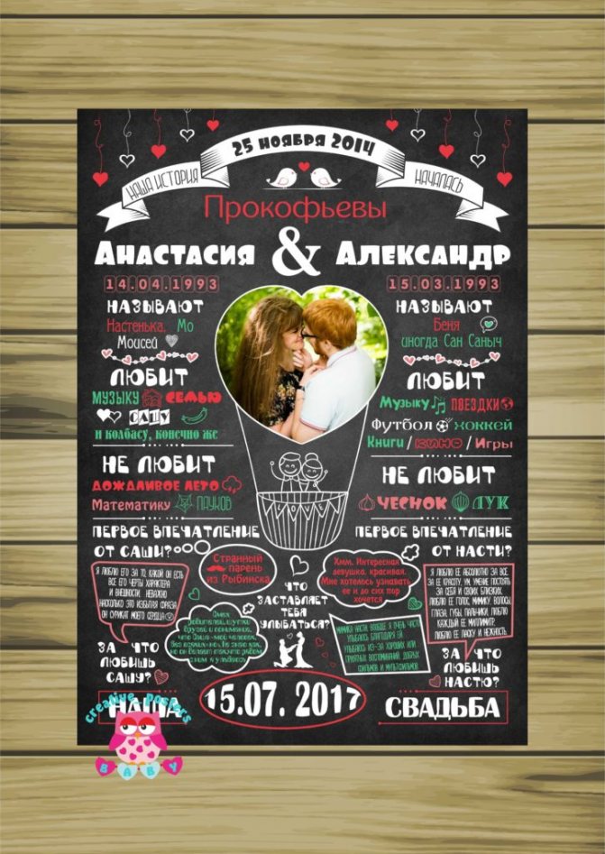 Например, это может быть история жизни жениха и невесты начиная с грудного возраста и до настоящего дня. Или история любви молодой пары, с шаржами и смешными картинками. Для тематической свадьбы изготавливаются плакаты соответствующего стиля.