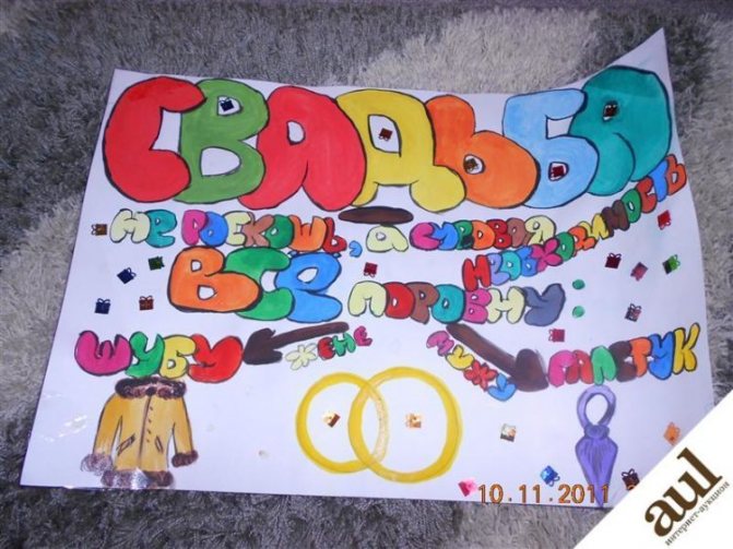 Плакат должен носить веселый, шуточно-развлекательный характер. Поэтому, необходимо использовать смешные выдержки, лозунги для плакатов, мудрые высказывания на соответствующую тему или придумать самим. К этим надписям необходимо нарисовать подходящие по смыслу картинки, чтобы было все гармоничней и интересней. Можно сделать коллаж из фото молодоженов, друзей, родственников. В этом случае фотографии лучше обвести маркером или фломастером, чтобы ярче их выделить.