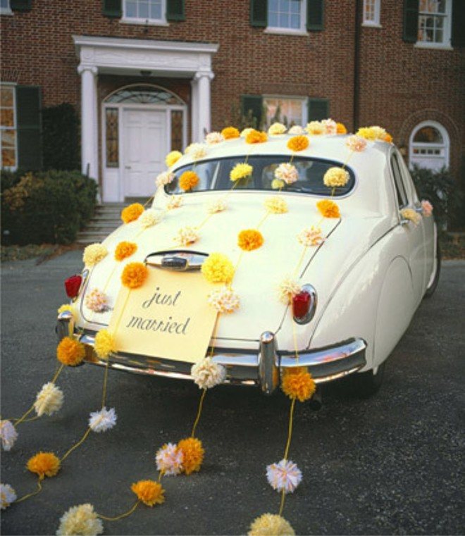 Обратите внимание, что цветовая гамма помпонов должна гармонировать с общим оформлением свадьбы.