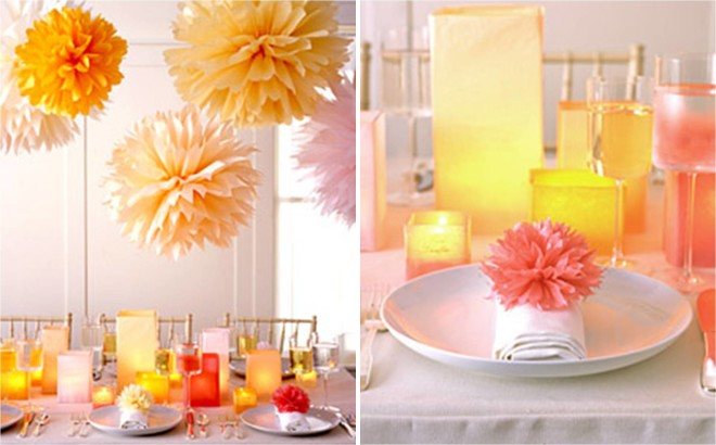 В-третьих, используя в декоре помпоны можно интересно и оригинально поиграть с цветовой гаммой свадьбы. Проще не бывает! Хотите взрыв сочных оттенков? Покупайте яркую бумагу разных цветов, и радужная свадьба готова! Желаете нежную розово-белую свадьбу? Тогда помпоны этих оттенков запросто украсят и создадут стиль вашего праздника!