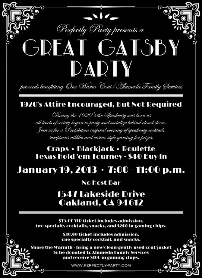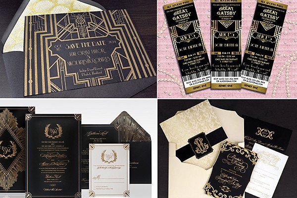 Можно придумать что-то оригинальное. Например, пригласительные в виде обложки романа, билета на «Великого Гэтсби» или газетной полосы: «В это воскресенье вновь состоится вечеринка по адресу, время, дресс-код». Вроде никакого пригласительного – так, маленькое упоминание, целиком в стиле Гэтсби.