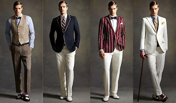 В целом мужской образ был сдержан, за исключением нарядных галстуков и бабочек – любые оттенки, полоска, клетка, даже горох. А еще платок в кармашке пиджака или бутон цветка на лацкане. Можно и то и другое, но тогда обязательно одного цвета. Добавьте пару аксессуаров, намекающих на достаток: трость, часы (к 20-м их уже носили на запястье), «дорогущие» запонки.