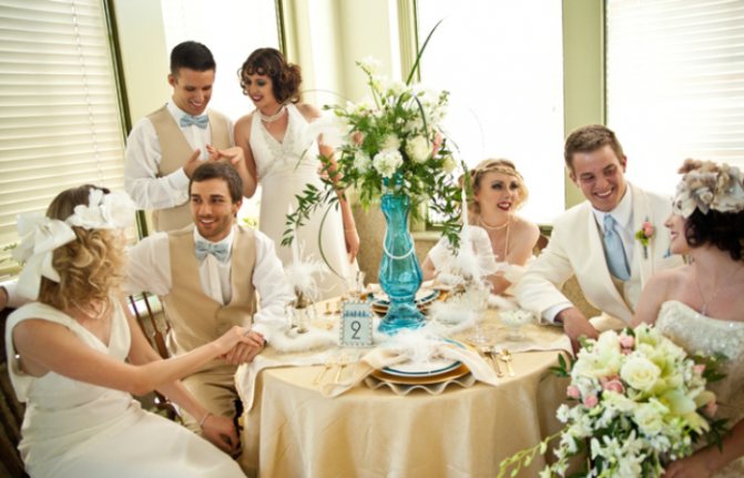 Подразумевается фуршет, так как вечеринка танцевальная, активная. Конечно, для свадьбы «у Гэтсби» лучше расставить небольшие столики на 3-4 персоны и нанять вышколенных официантов – еда и напитки должны появляться «из воздуха».