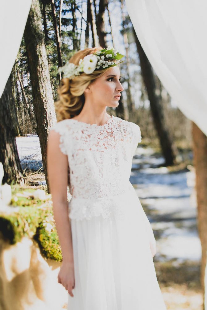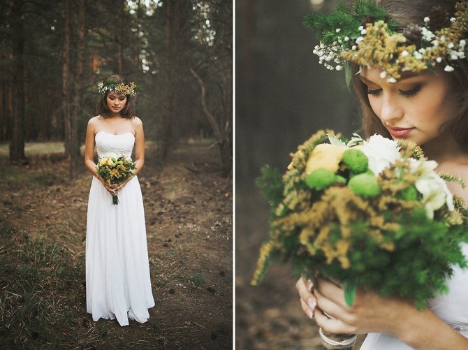 Венок также должен быть максимально простым, имитирующим полевые цветы: ромашки, васильки, незабудки. Лучше, чтобы причёска невесты была слегка небрежной: слегка подвитые волны распущенных волос или коса.