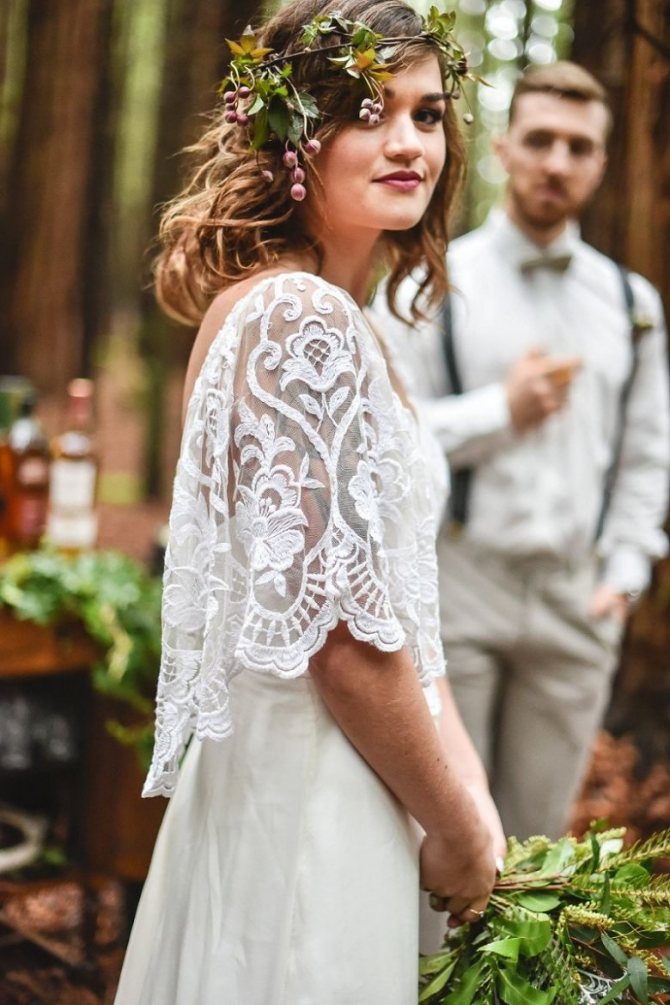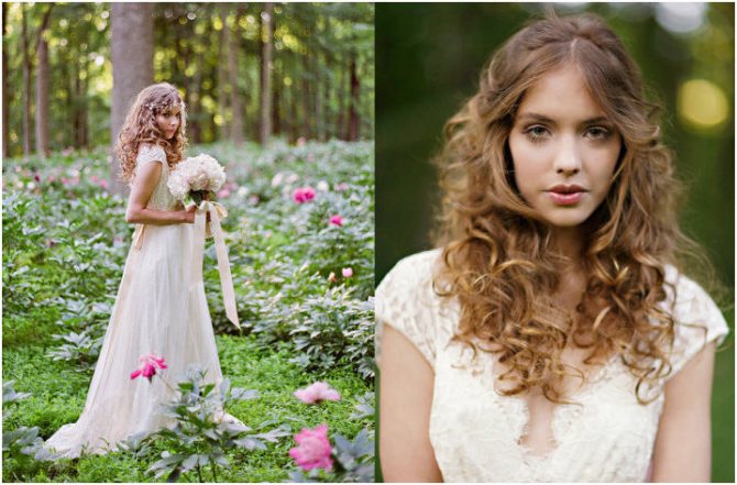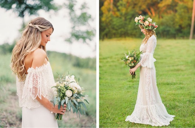 Образ новобрачной продумывают до мелочей, чтобы не внести вульгарность в воздушную легкость стиля. Прическа не терпит укладок или искусственных локонов, достаточно заплести волосы в косу и вытянуть несколько прядей. Прелестно выглядят цветочные бутоны в волосах, наполняющие образ особенной трогательностью. Макияж тоже выбирают приближенный к натуральным оттенкам, ошибочно использовать яркую помаду и слой тонального средства.