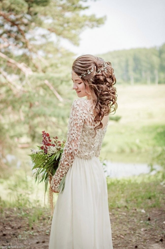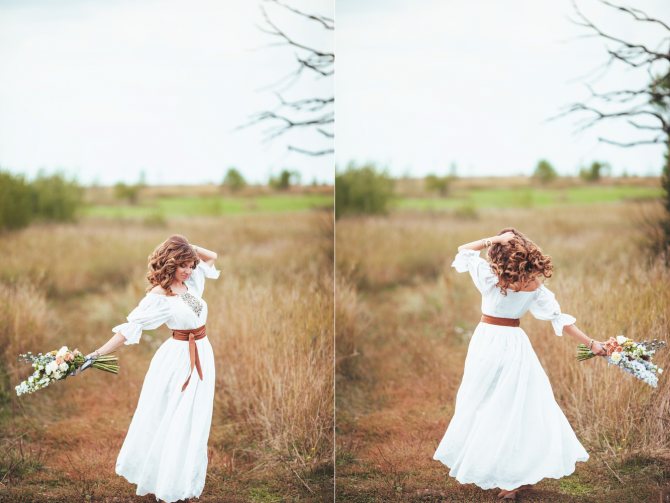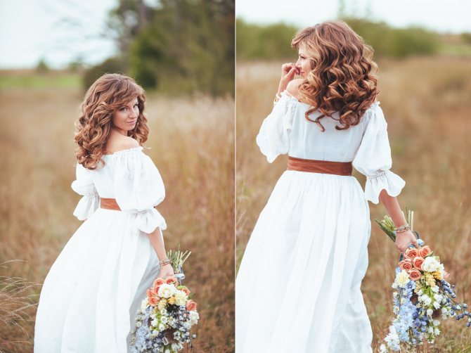 В качестве прически для рустикального платья подойдут простые варианты – косы, пучки, небрежные локоны. Никаких гелей, муссов и лаков для укладки. Придется забыть о начесах и сложных конструкциях: чем натуральные выглядят волосы, тем лучше.