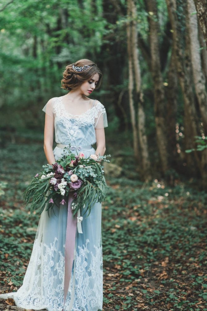 Те же правила относятся и к платью невесты, которое при грамотном подборе тона будет сочетаться с костюмом жениха. Цвет платья выбирается так, чтобы он вписывался в каноны рустика, при этом предлагается отойти от традиционного цвета свадебного наряда. Так как чисто белый в природе встречается редко, то для свадебного платья в рустикальном стиле отлично подойдут следующие цвета и оттенки: