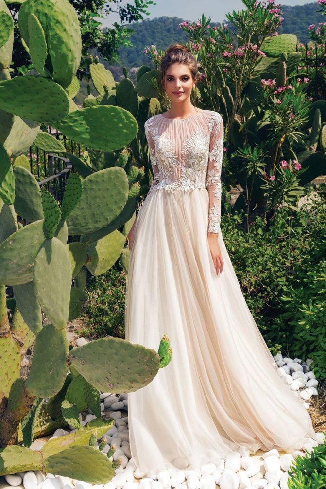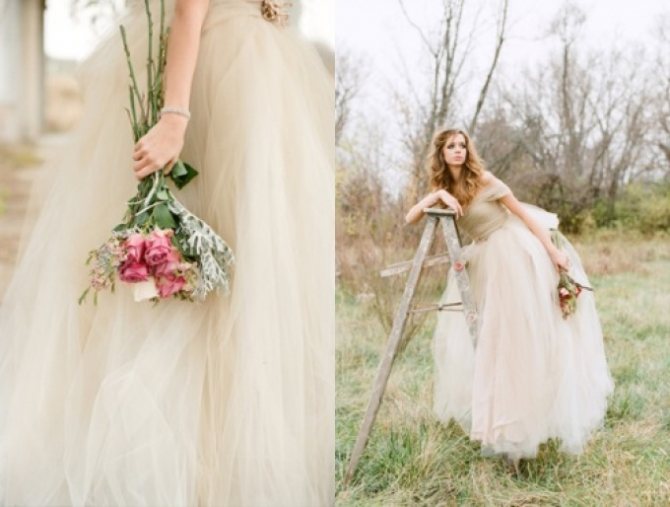 - Природные цвета. В стиле рустик отдается предпочтение не кипельно-белому, а более натуральным оттенкам: светло-бежевому, молочному, пудровому, что демонстрируют свадебные платья на представленных ниже фото.