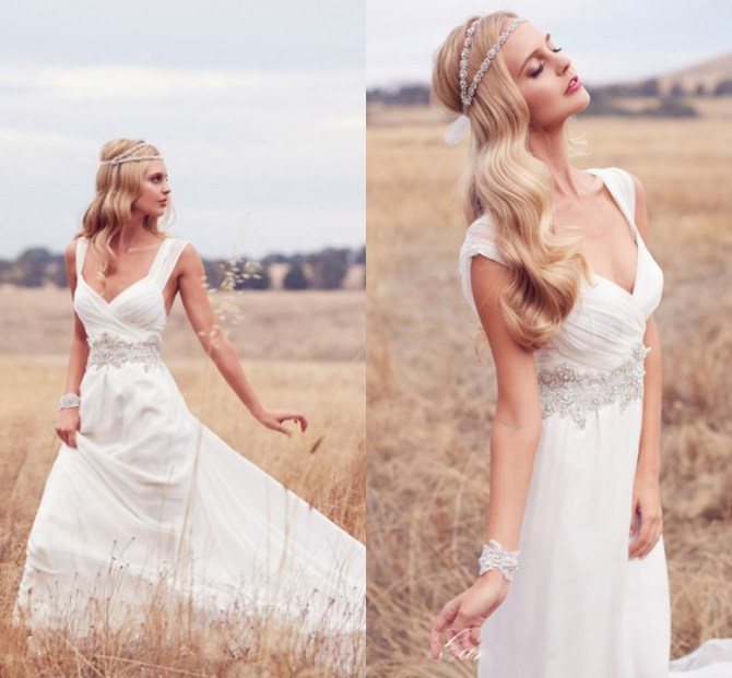 Фасон отлично вписывается в стиль рустик, благодаря простому и гармоничному силуэту. Для свадебного платья в стиле рустик с высокой талией характерен глубокий вырез и отсутствие рукавов.