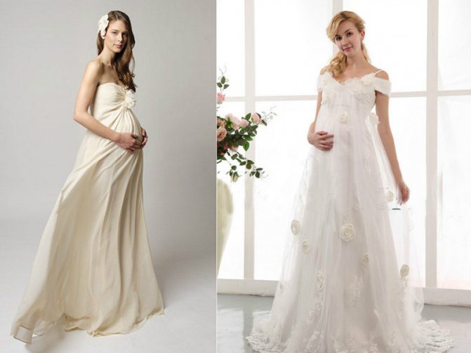 Платья с завышенной талией отлично подходят как полным, так и стройным девушкам. Неизменно им отдают предпочтение постоянные покупательницы – невесты в положении. Смещенная к груди линия талии скрывает животик и обеспечивает комфорт при движениях. Из-за способности скрывать недостатки, фасон часто выбирают полные невесты. Подойдет он и стройным девушкам, ведь завышенная талия наделяет образ легкостью, а струящаяся юбка – естественным очарованием.