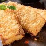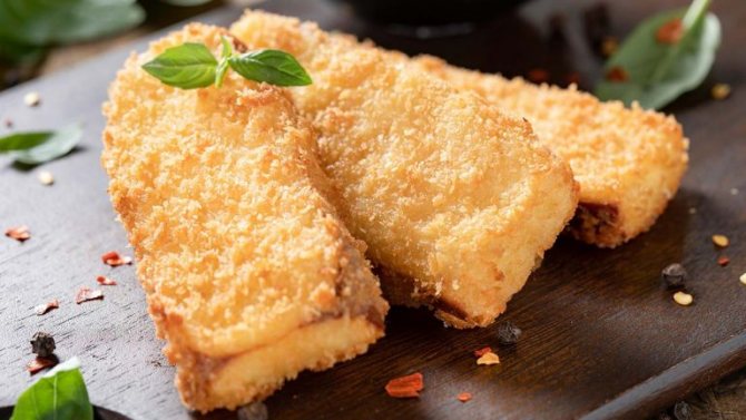- Яйцо нужно взбить при помощи вилки и окунуть в него нарезанный сыр, а после обваляв его в панировочных сухарях и обжарив с каждой стороны до образования золотистой корочки.