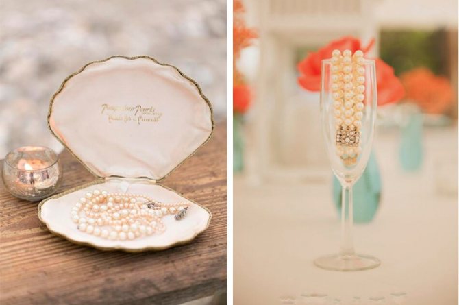 Исходя из прекрасного названия свадьбы, сразу приходит на ум все, что связано с жемчугом.