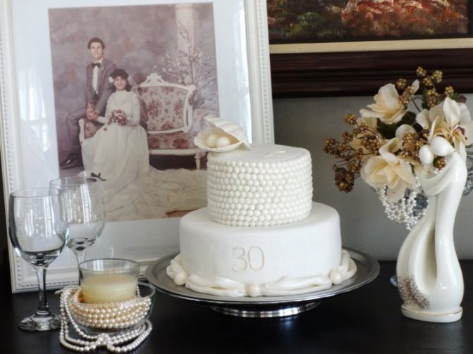 Традиционно на 30 лет свадьбы супруги дарят друг другу украшения из жемчуга в знак любви и верности. Согласно традициям предков, муж должен преподнести супруге ожерелье, состоящее из тридцати жемчужинок. Считается, что так мужчина извиняется перед избранницей за пролитые слёзы в браке. Не устраивает вариант ожерелья? Всегда можно выбрать другие украшения с жемчугом. Главное, основывать своё окончательное решение на предпочтениях супруги.