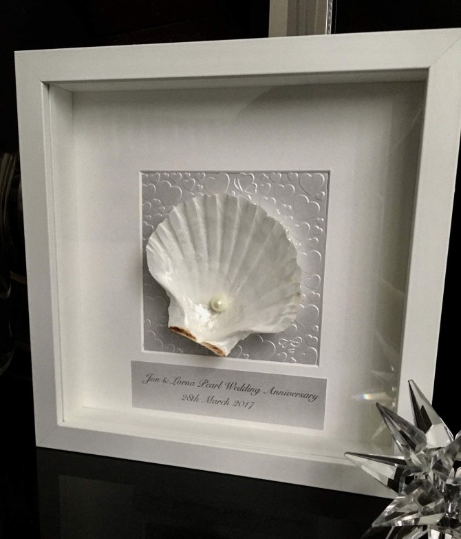 Красивая рамка с фотографиями памятный и приятный подарок на годовщину. Подчеркнуть символику жемчужной свадьбы поможет тематический декор и перламутровые оттенки. Не стоит ограничивать свою фантазию. Это может быть не одна, а целая композиция рамок для фотографий разного размера.