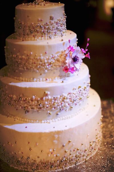 Заказ праздничного торта (белоснежного, многоярусного, украшенного «жемчужинками», белой глазурью), который произведет фурор. Символично торт разрежут сами «молодожены»