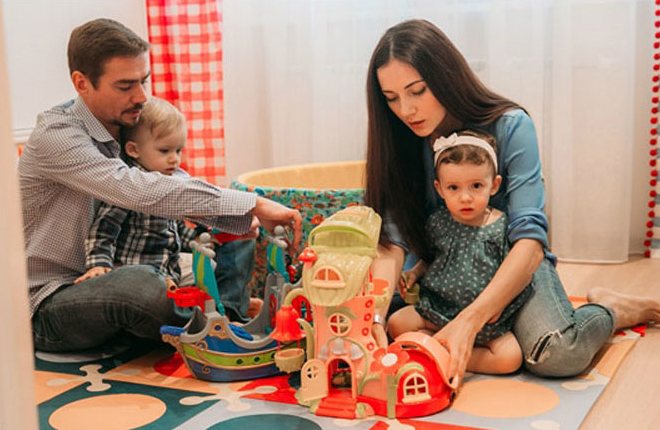 На месте гостиной располагается комната детей. Она самая большая по сравнению с остальными. Одинаковые белые кроватки стоят параллельно друг другу в начале комнаты, игровая зона расположена у окна. Детская оформлена в светло-бежевые тона. На полу постелили мягкий ковролин разных цветов, чтобы детям было комфортно и весело бегать по нему босиком. Цветовая гамма подобрана с тем учётом, что в комнате живут два ребёнка разных полов. Дети могут поиграть в застольные игры, «поплавать» в бассейне из шариков, поиграть игрушками в свободной игре.